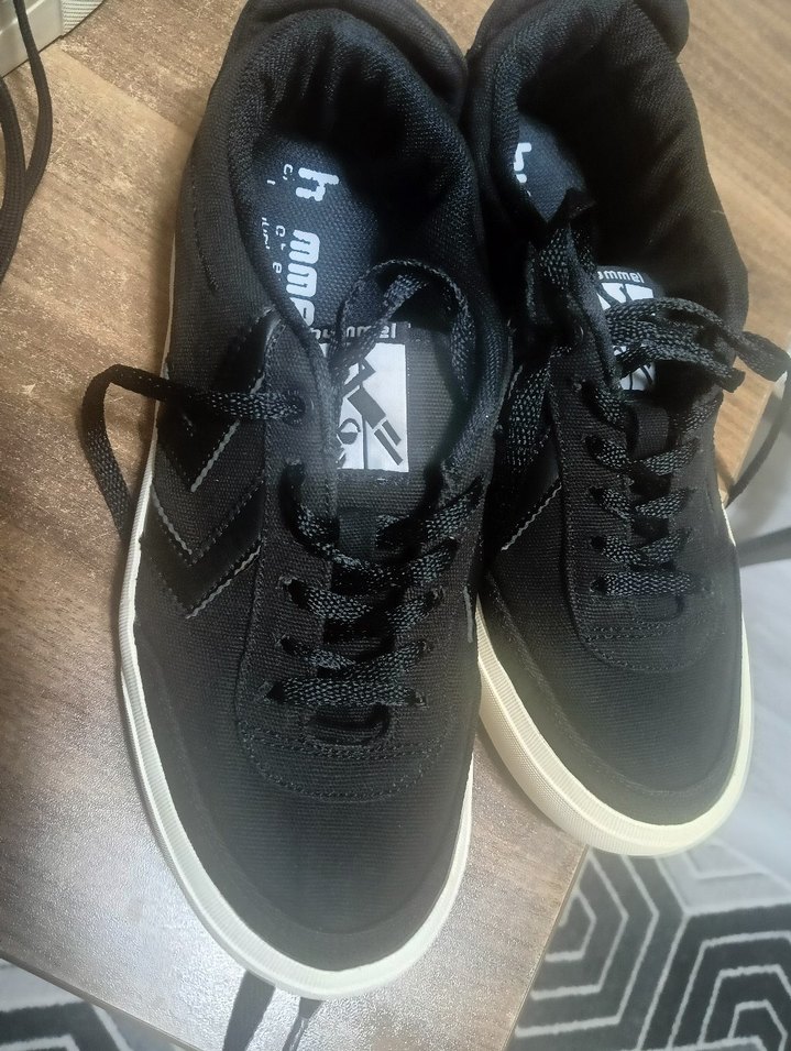 Siyah Hummel basketbol ayakkabısı, velcro kapanışlı, baskılı desenli ve kauçuk tabanlıdır. Spor ve sokak stili için uygundur.