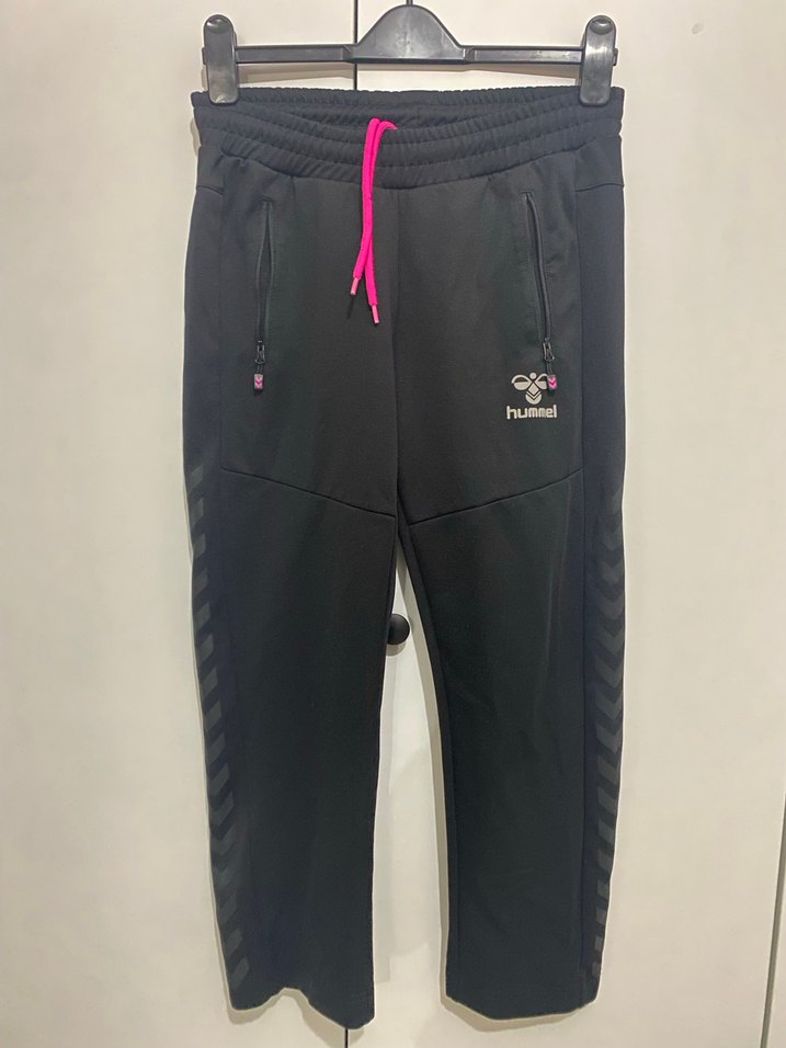 Siyah renkli, pembe bağcıklı Hummel fermuarlı, rahat kesim eşofman. Yumuşak ve sıcak kumaştan, ürün sayılı giyildi yeniden farksız