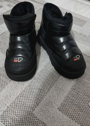 Siyah kauçuk erkek çocuk botu, cırt cırtlı ve yumuşak astarlı, önünde "P" logosu bulunan sade tasarım. Sokak stili için uygun.İç yününden dolayı kalıp olarak küçüktür.