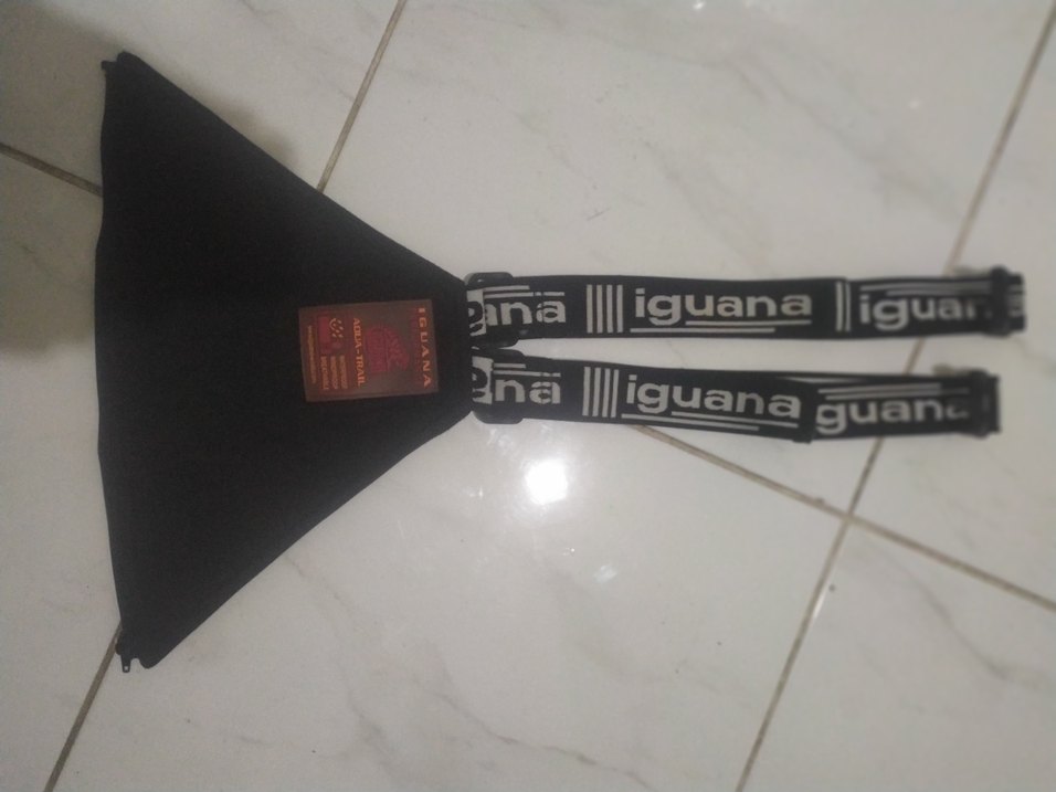 Siyah renkte, 'iguana' yazılı erkek askısı, sokak modasına uygun athleisure tarzında.