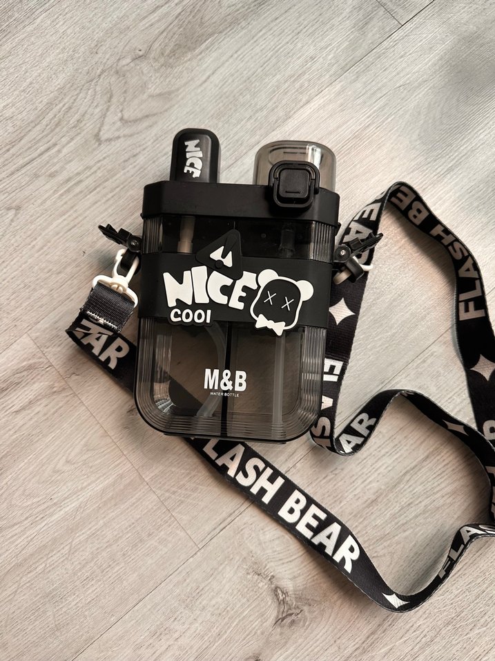 Siyah renkli çocuk termos şişesi, taşıma askısı ve güvenli kapak ile kullanıma hazır. Üzerinde eğlenceli yazı ve grafikler bulunur. Oğlum bir heves aldırdı iki kere kullandı tertemiz duruyor.