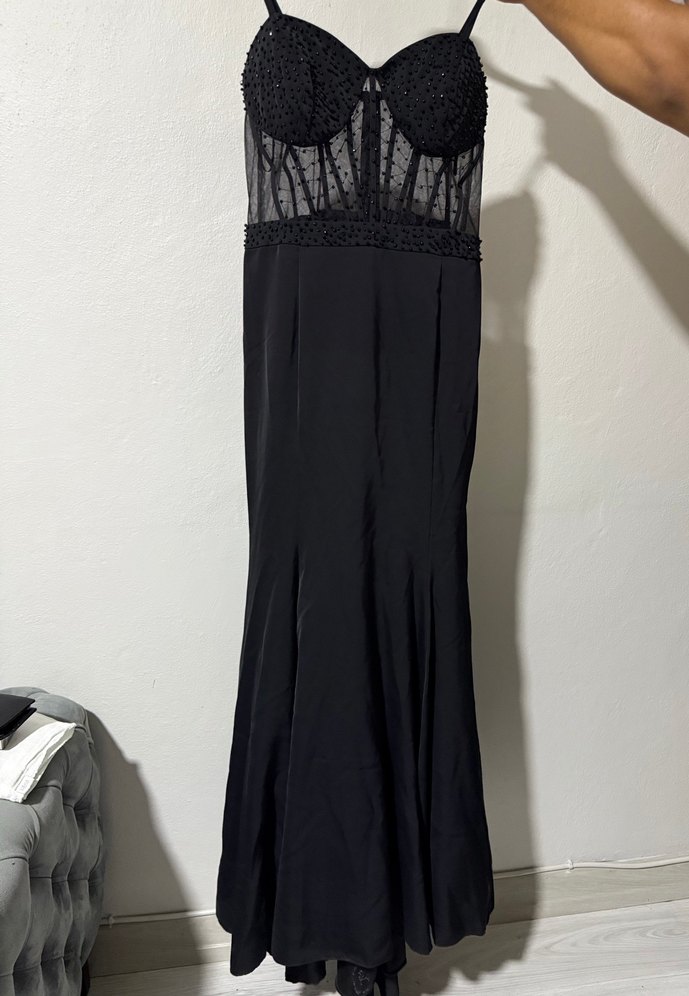 Siyah, straplez yakalı ve askılı detaylı, drapeli, vücuda oturan uzun gotik abiye elbisedir. 1 kez kardeşimin düğününde giymiştim.