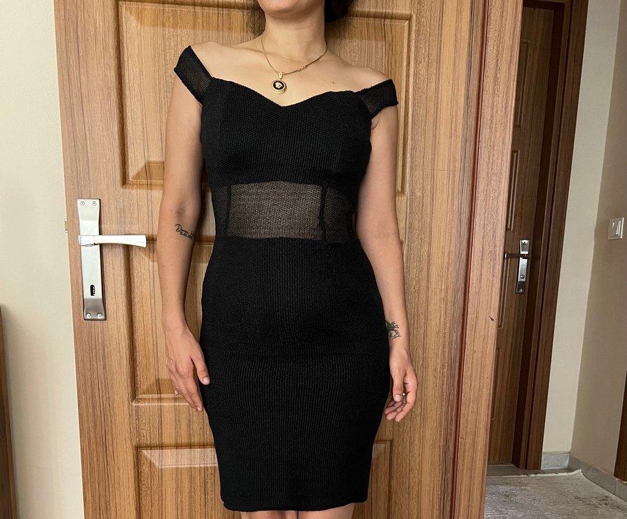 İnce askılı, tek renk siyah abiye triko değildir hiç kullanmadım davette düğünde giyilebilir içi astarlıdır