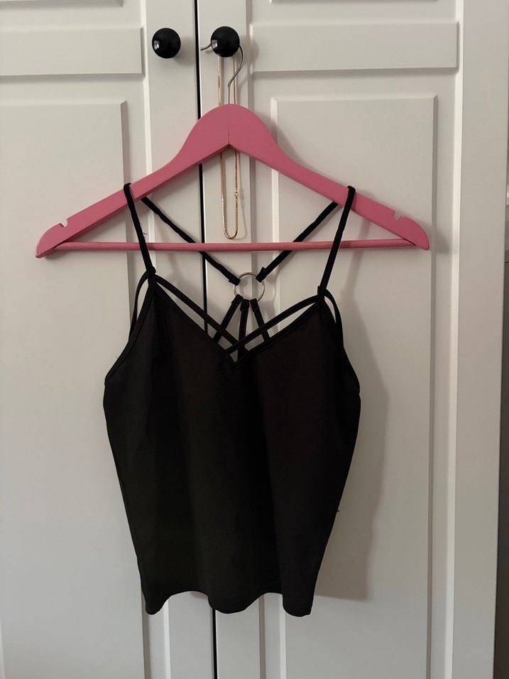 Siyah ince askılı, ön kısmında şerit detaylı şık ve modern görünümlü bluz. Kumaşı düzgün ve vücuda oturan yapıda.