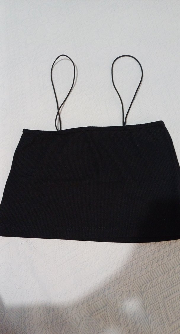 Siyah, ince askılı ve elastik kumaştan yapılmış, gündelik kullanım için uygun, sade ve düz desenli crop top.