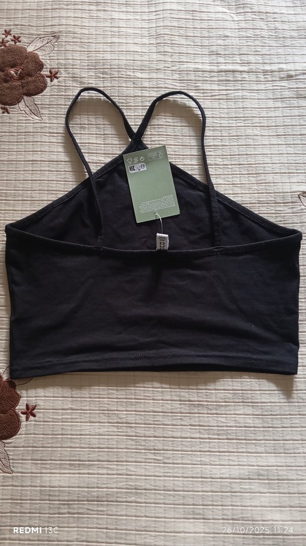 Yumuşak pamuktan yapılmış, ince askılı ve yüksek yakalı siyah, vücuda oturan crop top. Bohem ve sokak stiline uygun, açık hava kullanımı için idealdir.