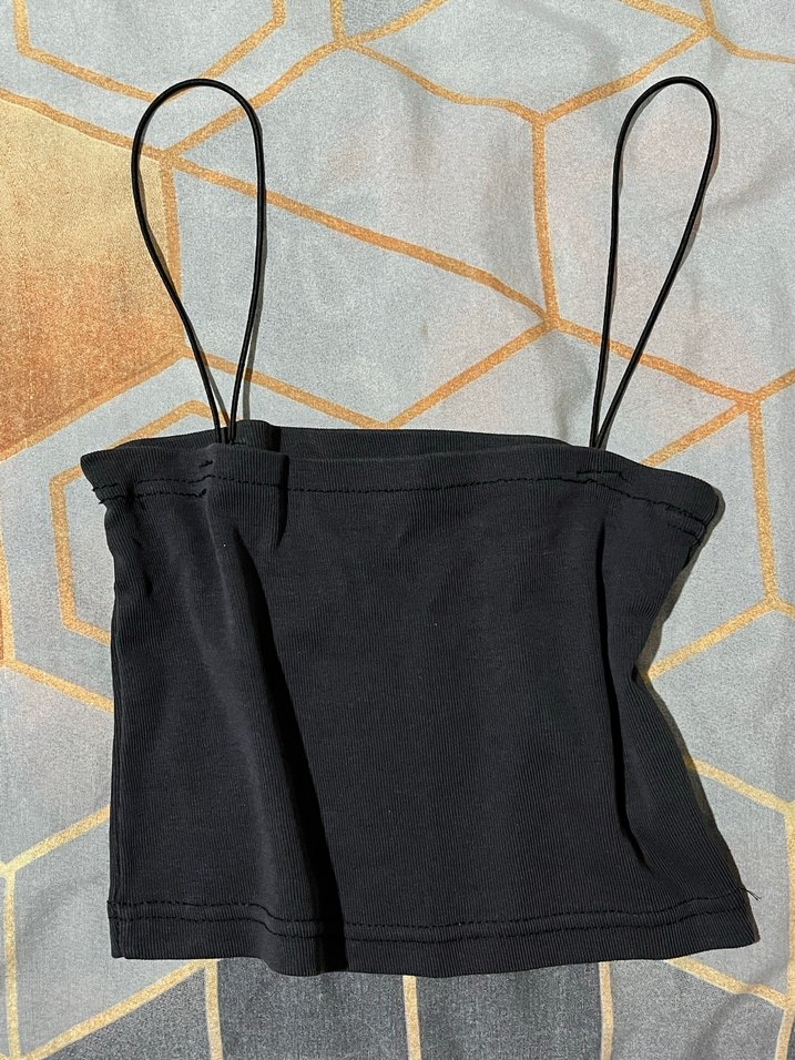 Siyah, ince askılı ve straplez yaka kadın atlet, yumuşak sentetik kumaştan olup günlük kullanıma uygundur.
