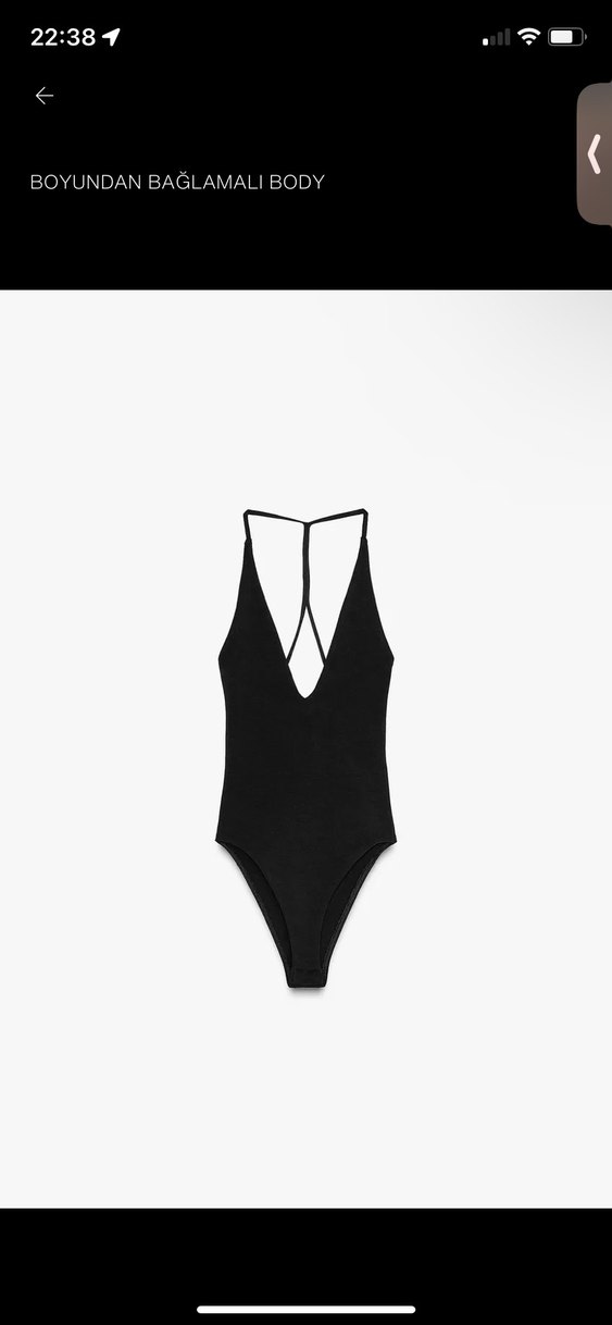 Siyah, ince askılı ve derin V yakalı bu dar kesim body, çağdaş ve minimalist bir tarz sunar, günlük kullanım için zahmetsiz şıklık sağlar. Hiç giyilmedi.