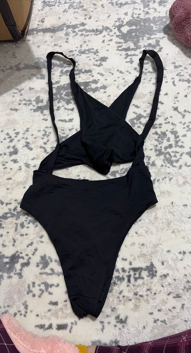 Siyah renkli, ince askılı ve vücuda oturan kadın mayo. Goth tarzı ve athleisure etkisiyle rahat ve şık, midi uzunlukta, desensiz model.