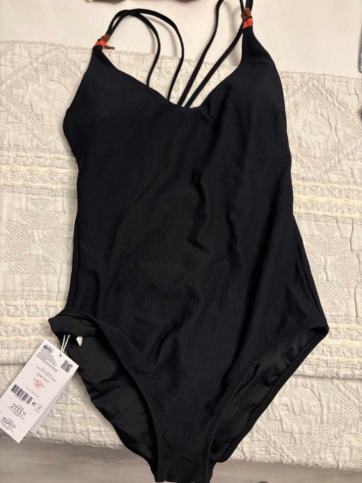 Siyah renkte, ince askılı ve vücuda oturan kadın mayo. Düz ve desen içermeyen tasarımıyla spor bir mayo. Hamilelik zamanımda 2 tane mayo almıştım dönüşümlü giymek için 2-3 defa giydim sadece