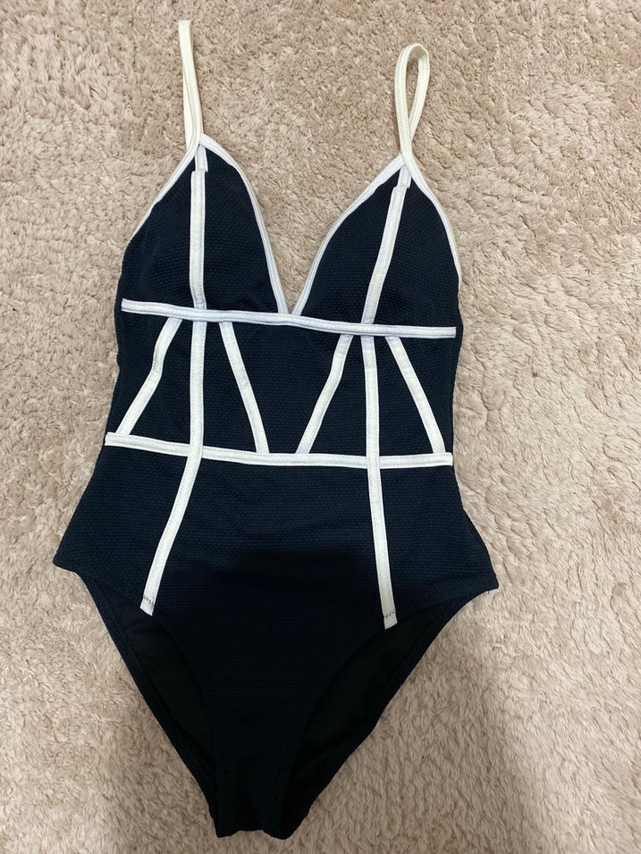 İnce askılı, siyah kumaş üzerine beyaz çizgilerle tasarlanmış, normal boyda ve şık kesime sahip kadın mayo. ️