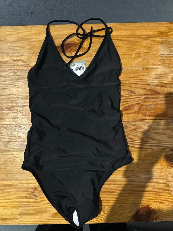 İnce askılı, vücuda oturan siyah kadın mayo, midi boyda ve desen içermeyen sade tasarımıyla plajda cesur ve şık bir görünüm sunar.
