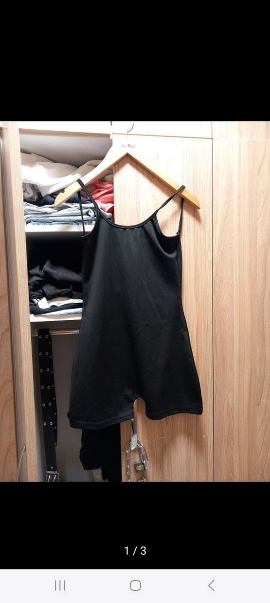 Siyah, ince askılı ve kolsuz, vücuda oturan tulum, rahat sentetik kumaştan üretilmiştir. esnek likrali ve sirt dekolteli. kutu butikten aldim