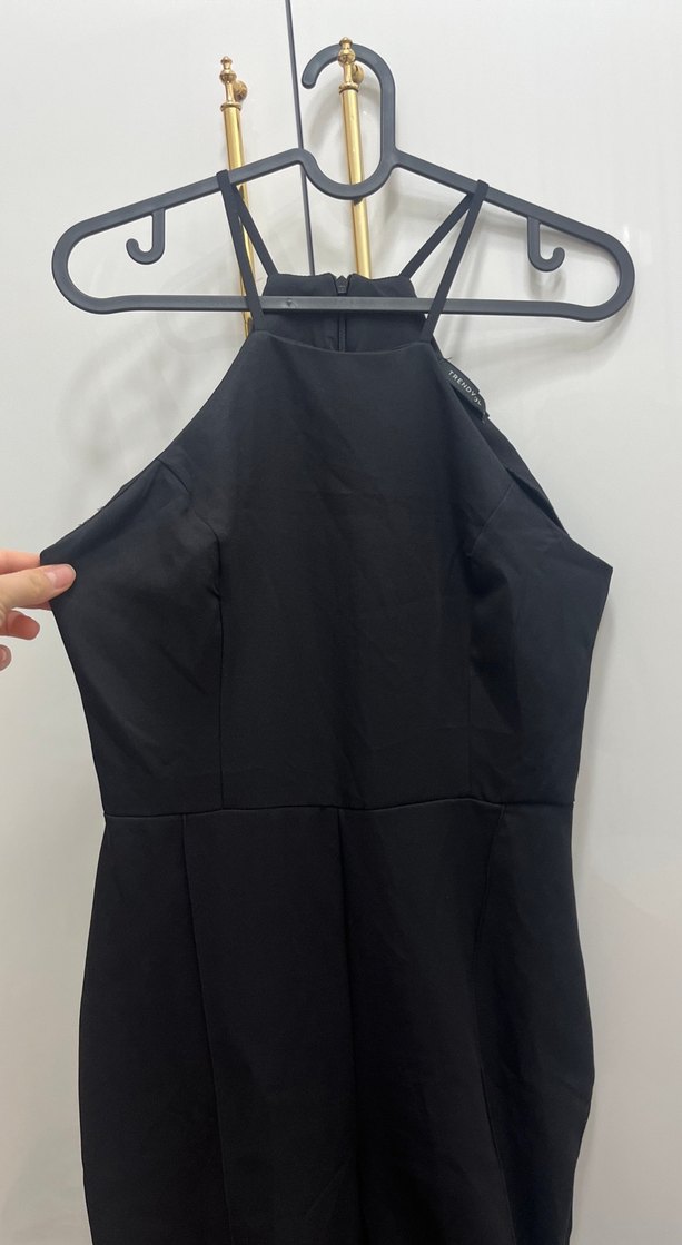 Yüksek yakalı, ince askılı ve fermuarlı siyah tulum ofis kullanımı için uygun şık ve sade tasarım.