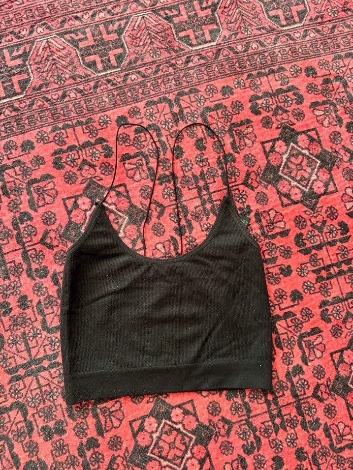 Sentetik kumaştan yapılmış, ince askılı ve straplez yakalı, siyah koyu batik desenli, günlük kullanım için uygun, grunge punk tarzında fitted crop top.