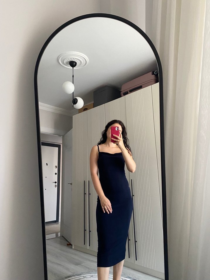 İnce askılı, düz yakalı, siyah midi elbise, ipeksi kumaştan ve rahat şıklık sunar. Romantik akşamlar için ideal.