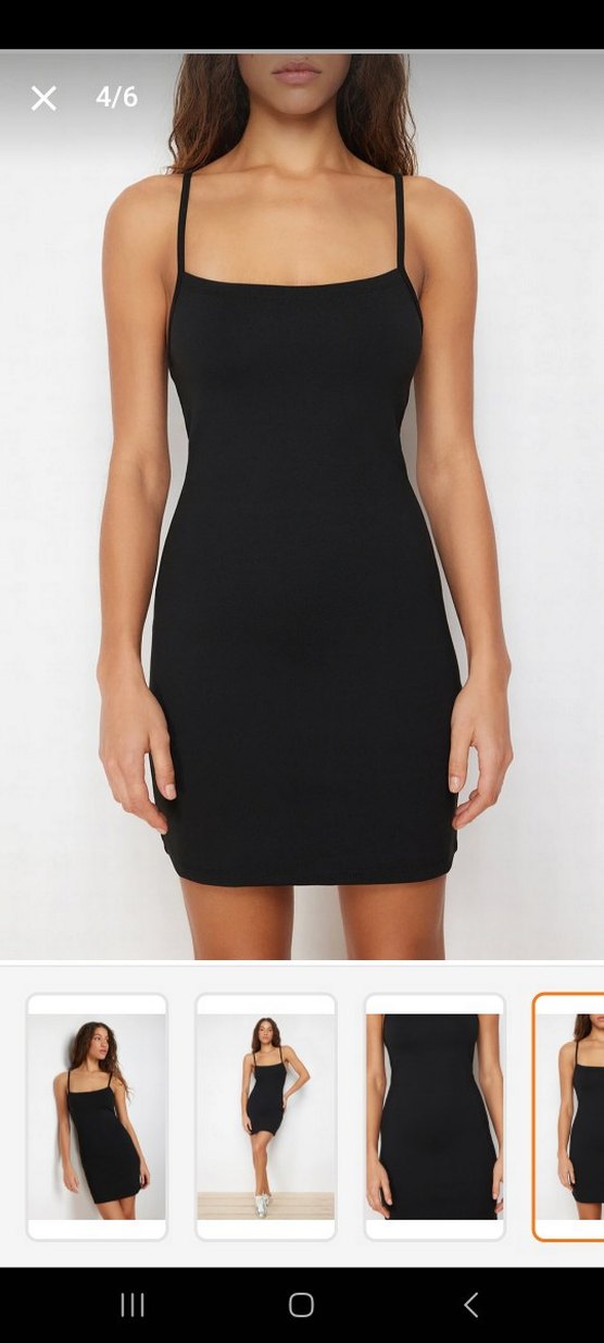 Siyah, ince askılı ve V yakalı bu midi elbise, rahat sentetik kumaştan üretilmiştir. Cesur ve minimalist tarzda, romantik geceler için uygundur.