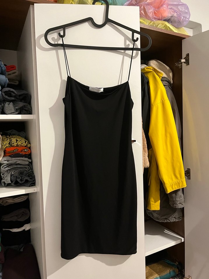 İnce askılı, düz yakalı ve siyah renkli bu dar kesim midi elbise, romantik buluşmalar için minimal ve gotik tarzda şık bir seçimdir.