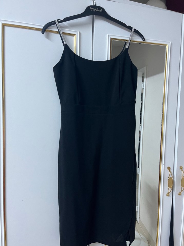 Siyah renk, ince askılı ve straplez yaka detaylı, klasik ve sade gotik tarzda midi elbise, ofis kullanımına uygundur.