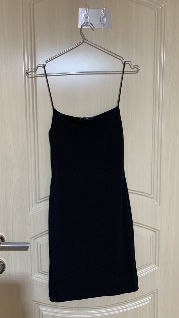 İnce askılı, V yakalı siyah midi boy elbise, minimal ve gotik tarzda, günlük kullanıma uygun rahat şıklık sunar.