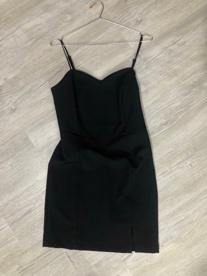 Siyah, ince askılı, V yakalı ve drapeli detaylı, vücuda oturan midi uzunlukta minimalist tarzda günlük kullanıma uygun gece elbisesi.