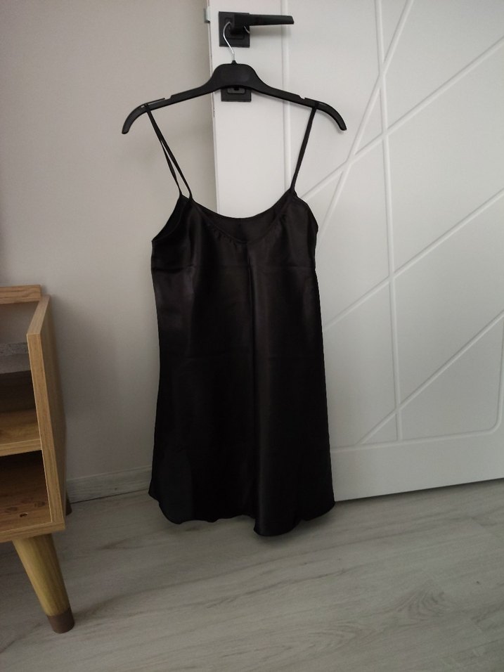 İnce askılı, V yaka, siyah midi elbise, satenimsi dokuda, fit kesim ve minimalist gotik tarzda, günlük kullanıma uygundur.bedeni m-L