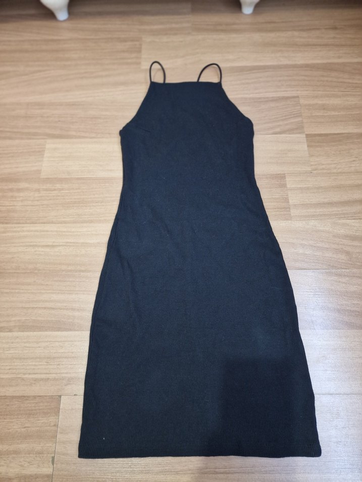 Yumuşak sentetik kumaştan, ince askılı ve yüksek yakalı siyah, vücuda oturan midi örme elbise. Günlük sokak stili için minimalist ve sade bir tercih.