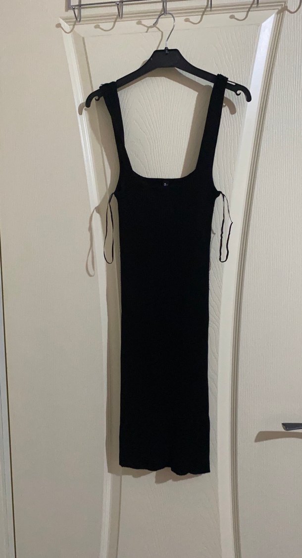Siyah, ince askılı ve halter yakalı triko elbise, sentetik dokusu ile midi boyda. Minimalist, şık ve gündelik kullanıma uygun.