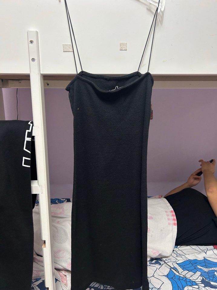 Siyah renkli, ince askılı ve düz yakalı fitilli elbise dar vücuda yapışıyo hiçbir sorunu yok