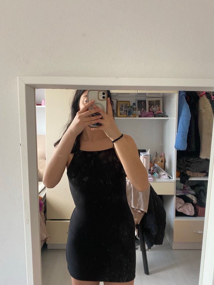İnce askılı ve düz yakalı bu siyah elbise, minimalist gotik tarzda, şık ve zahmetsiz bir görünüm sunar. Normal midi boyda ve günlük kullanıma uygundur.