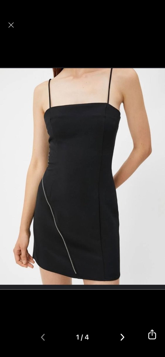 İnce askılı, siyah mini elbise, çapraz fermuar detayı ile şık ve modern bir görünüme sahiptir.