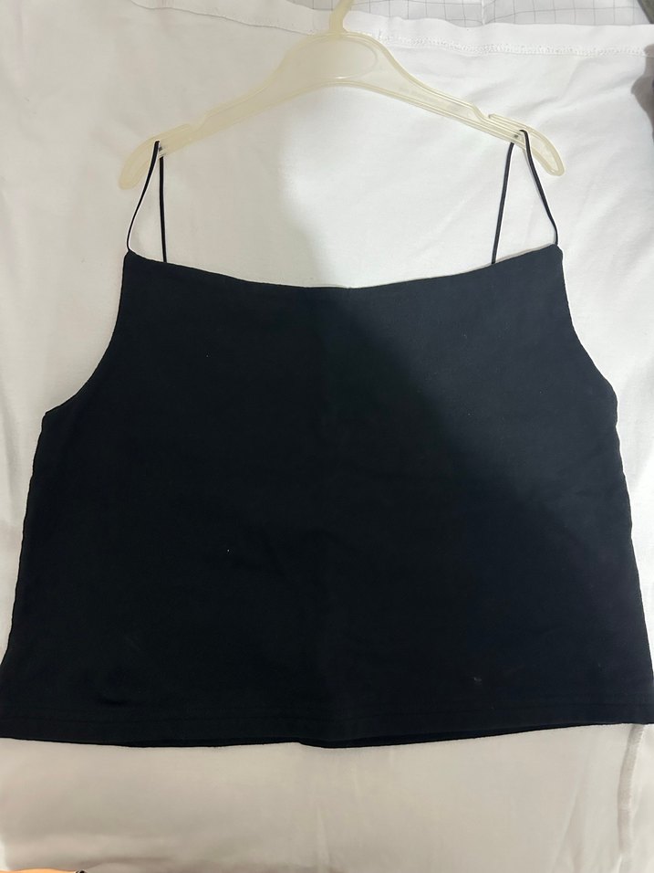Siyah, ince askılı, kısa ve dar kesim kadın crop .Yumuşak sentetik kumaştan, minimalist ve sokak stiline uygun.
