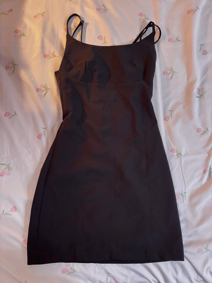 İnce askılı, fermuarlı, siyah renkte dar kesim mini elbise, romantik goth tarzda. Bir kez giyildi. S beden. Polyester Lycra kumaş. Defosu yoktur.