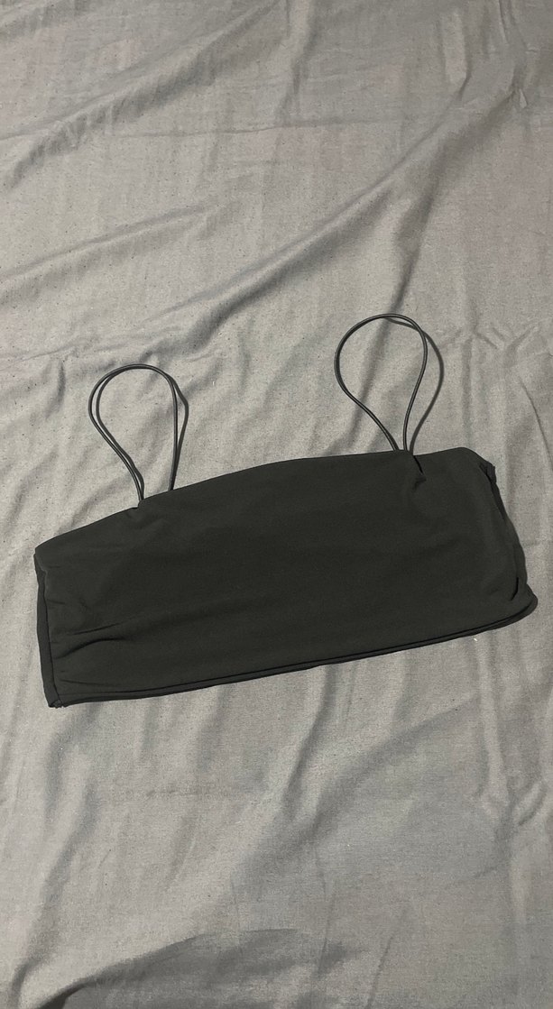 Siyah, ince askılı ve desensiz tasarıma sahip minimalist büstiyer. Normal midi boyda, sokak stiline uygun rahat bir model.