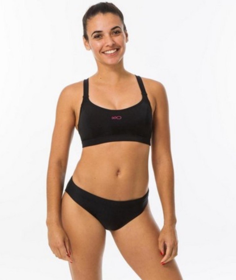 Siyah, ince askılı ve desen içermeyen, spor aktiviteleri için uygun, rahat ve şık tasarıma sahip bikini. İçinde ip bulunmaktadır beli ayarlanabilir. ♀️