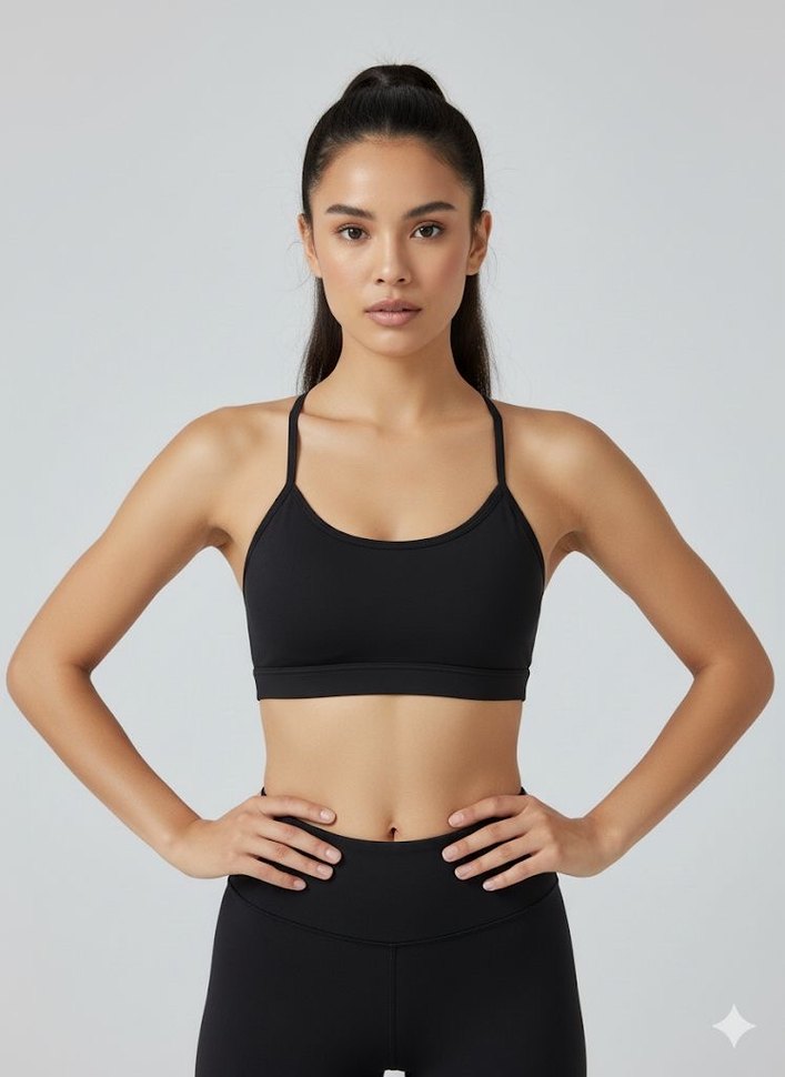 Siyah, ince askılı ve düz yaka, vücuda oturan spor büstiyer. Pürüzsüz sentetik kumaştan, iddialı sokak stili için uygun. Standart beden