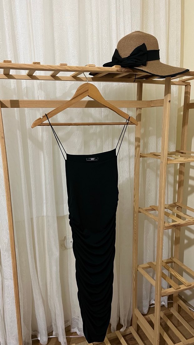 Siyah İnce Askılı Uzun Drapeli Abiye Elbise