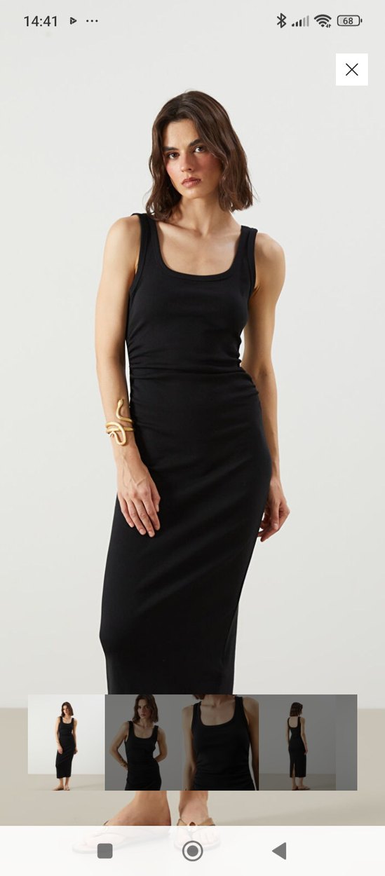 İnce askılı, tek renk siyah uzun elbise, satenimsi kumaş ve tekne yakası ile modern ve minimalist bir tarz sunar. Günlük kullanıma uygun, zahmetsiz şıklık sağlar.