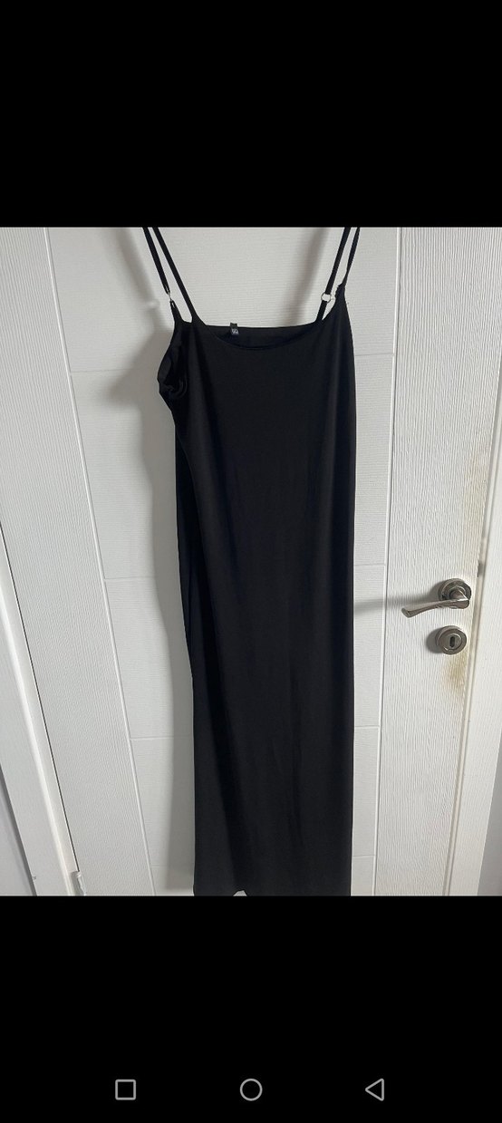 Siyah, ince askılı ve düz yakalı, sentetik kumaştan yapılmış, minimalist gotik tarzda, vücuda oturan uzun elbisedir. Günlük kullanıma uygundur.