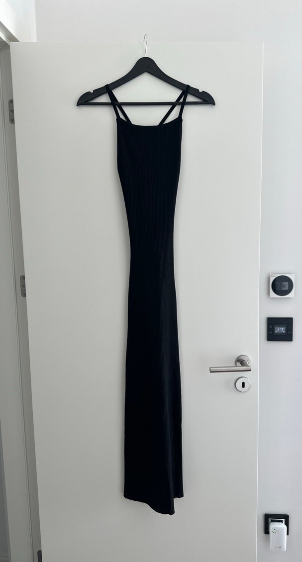 Siyah, ince askılı, düz yakalı ve vücuda oturan uzun elbise. İpeksi dokusuyla ofis için minimal ve goth tarzda şık bir seçenek.
