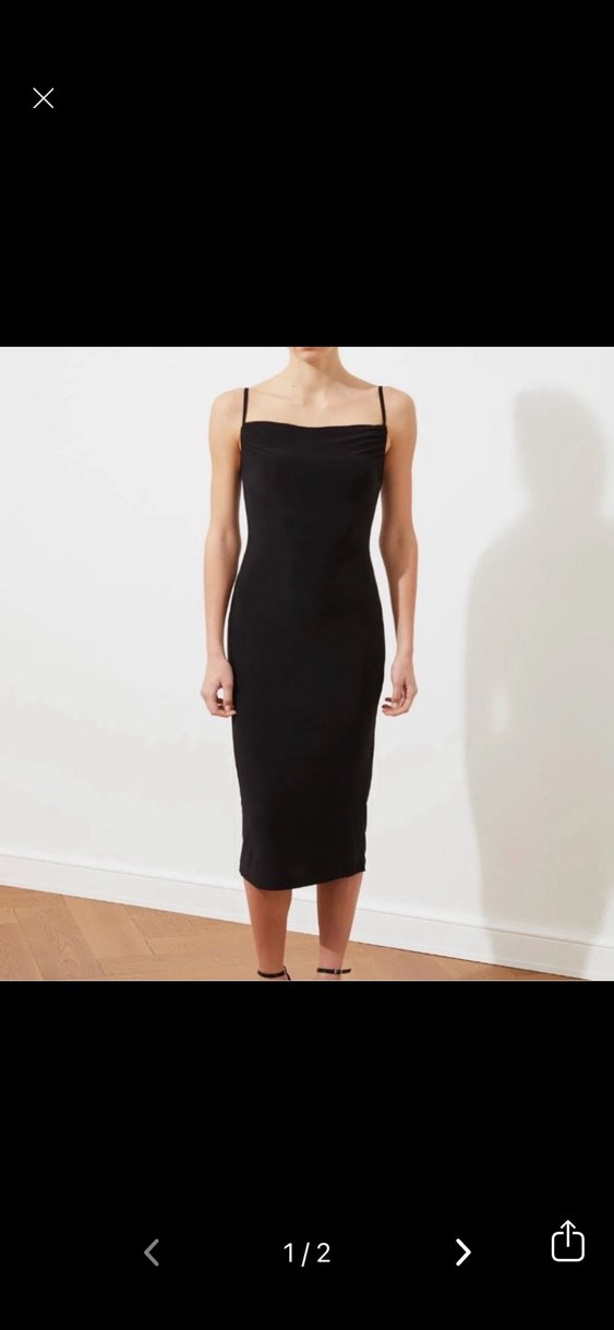 İnce askılı, tek renk siyah kalem elbise, tekne yaka ve sıkı kesimle sade ve şık bir görünüm sunar. Sentetik kumaştan yapılmıştır ve romantik akşamlar için uygundur.