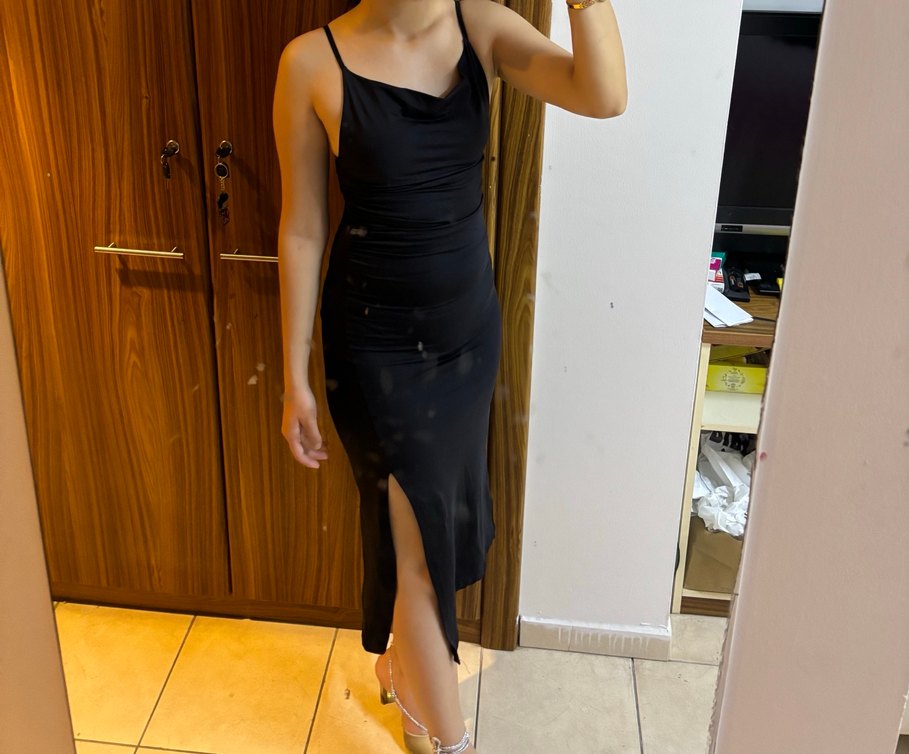 İnce askılı, drapeli V yakalı, saten dokulu siyah midi elbise. Yan yırtmaç detaylı, romantik akşamlar için uygun.