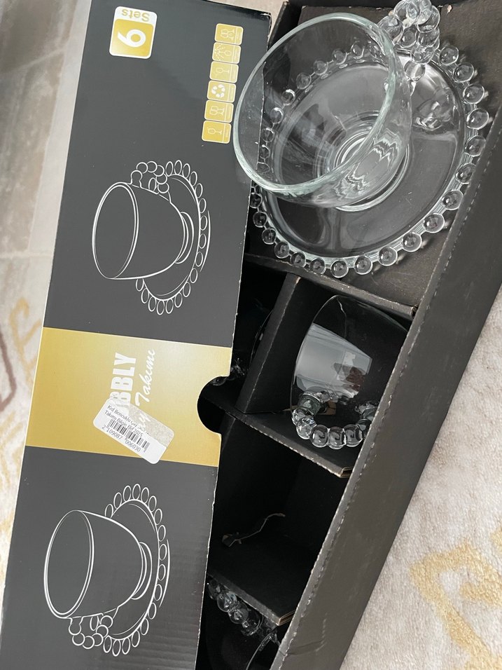 Siyah ince cam fincanlar ve boncuklu kenarlı tabaklardan oluşan servis seti. ☕