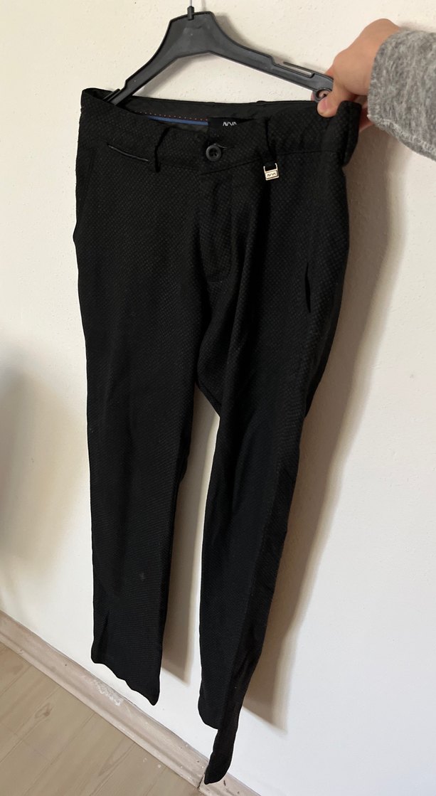 Siyah, ince kesim erkek pantolon, midi boy ve tokalı detaylıdır. Ofis ve iş ortamları için uygundur. Sentetik kumaştan yapılmıştır.