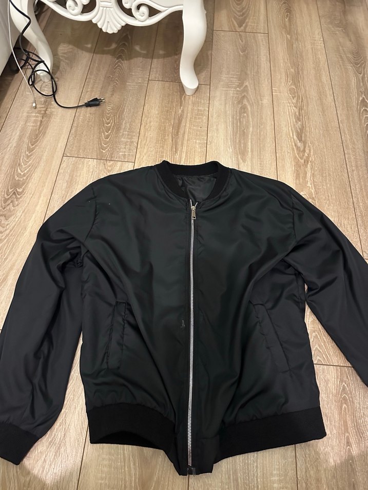 Fermuarlı ve bisiklet yaka olan siyah kadın ceketi. Uzun kollu, normal kesim ve yumuşak sentetik kumaştan üretilmiştir.