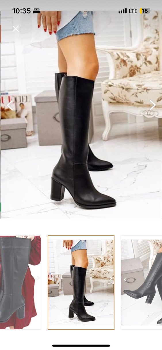 Siyah diz altı çizme, ince topuklu ve düz yüzeylidir. Ürün hala kutusunda açılmadı çok şık ve zarif duruyor bende bacaklarım çok kalın olduğu için fermuarı sıkıyor alana hayırlı olsun