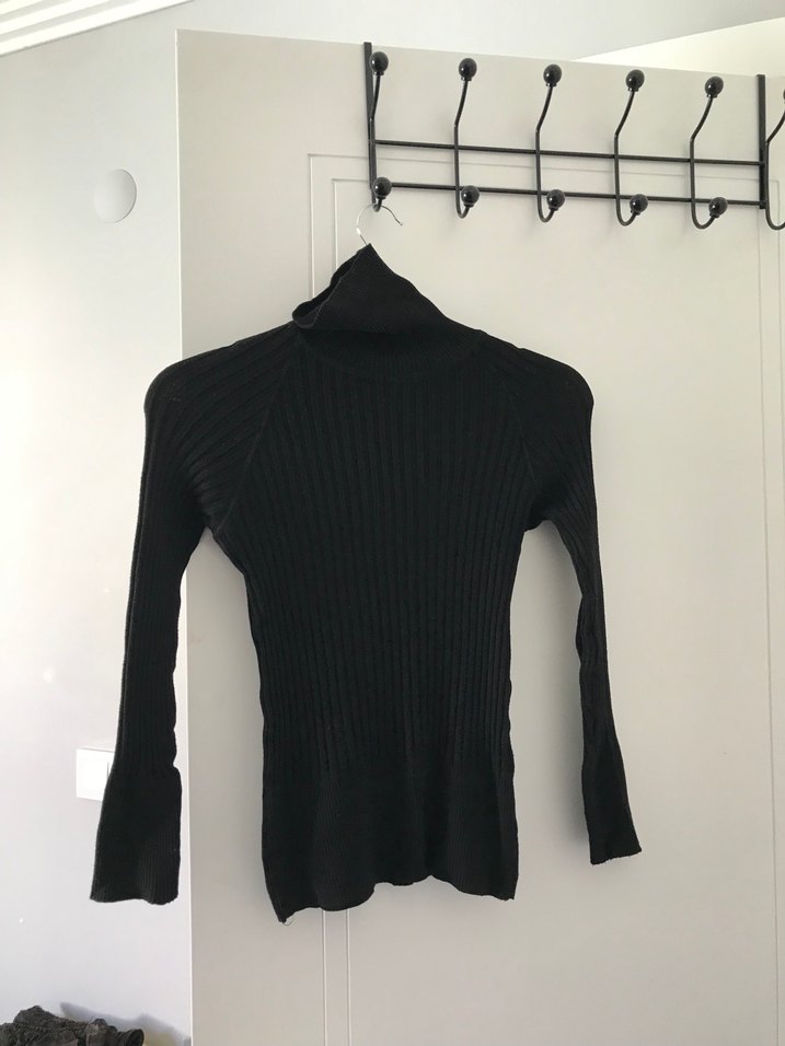 Siyah, ince triko kumaştan boğazlı ve uzun kollu, vücuda oturan minimalist goth tarzında günlük kullanıma uygun kazak.