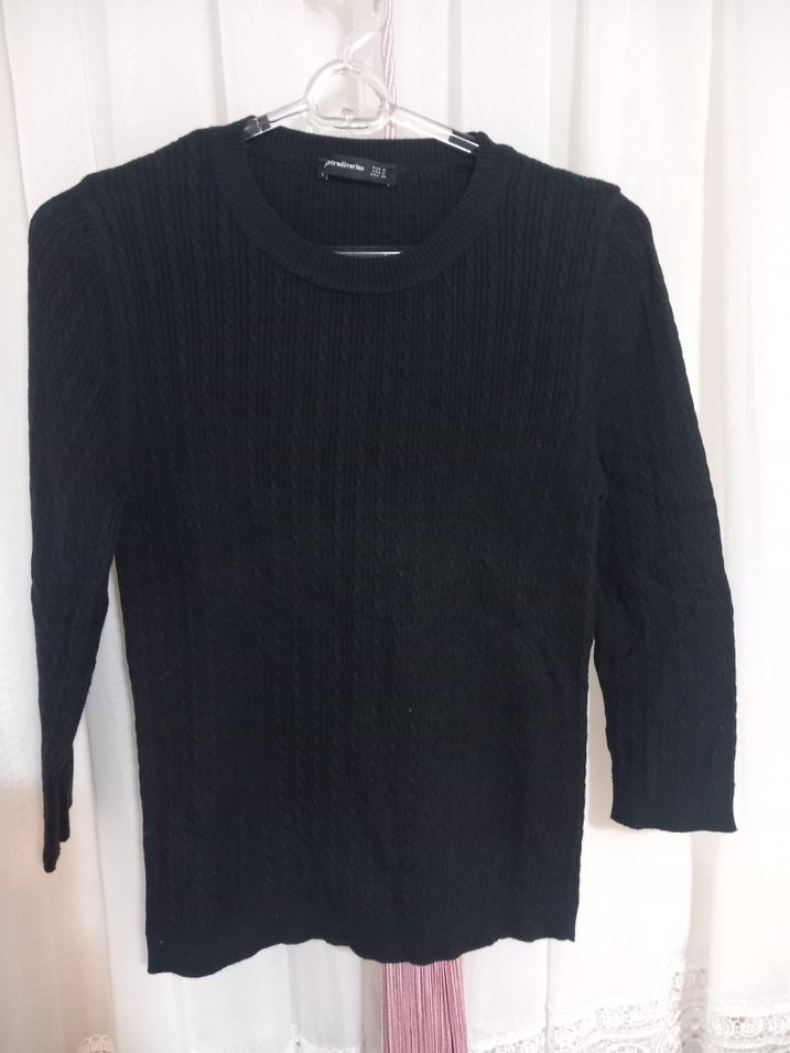 Siyah renkli, ince örme kumaştan yapılmış, yuvarlak yakalı ve uzun kollu kadın kazak. Minimalist ve desen içermeyen, vücuda oturan midi uzunlukta tasarlanmıştır.
