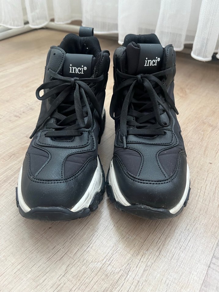 İnci markalı siyah bağcıklı kadın spor ayakkabısı, lastik tabanlı ve ince topuklu, trend sokak stili için uygundur.