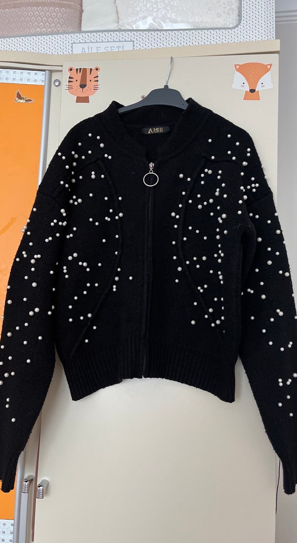 Siyah triko hırka, uzun kollu ve kısa kesimdir. İnci detaylı nakışlarıyla hem rahat hem şık bir görünüm sunar. Günlük kullanıma uygundur. Sadece etiketi eksik